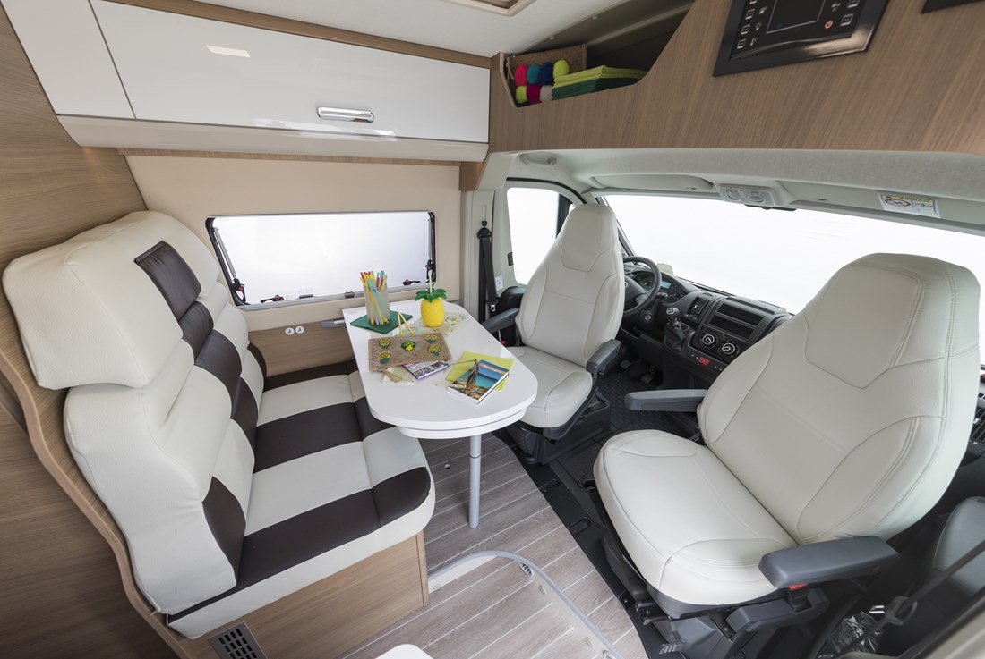 A parte i camper più datati, le quattro sedute della dinette hanno tutte i poggiatesta, cinture di sicurezza a tre punti per i posti fronte marcia e addominali per quelli contromarcia. Spesso in una delle due cassapanche è alloggiato il serbatoio dell’acqua potabile, mentre l’altro è utilizzabile completamente o in parte per lo stivaggio.