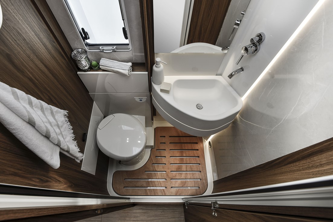 Tra queste due possibilità, in camper le soluzioni dimensionali e di arredo per la toilette sono molteplici, ma è verosimile sintetizzarle sostenendo che elementi primari della toilette sono pur sempre un wc chimico con serbatoio estraibile dall’esterno e quasi sempre con tazza girevole che ottimizza lo spazio a disposizione, un lavabo con miscelatore monocomando, un piatto doccia che può avere anche la funzione di pavimento o far parte di un box a sé stante.