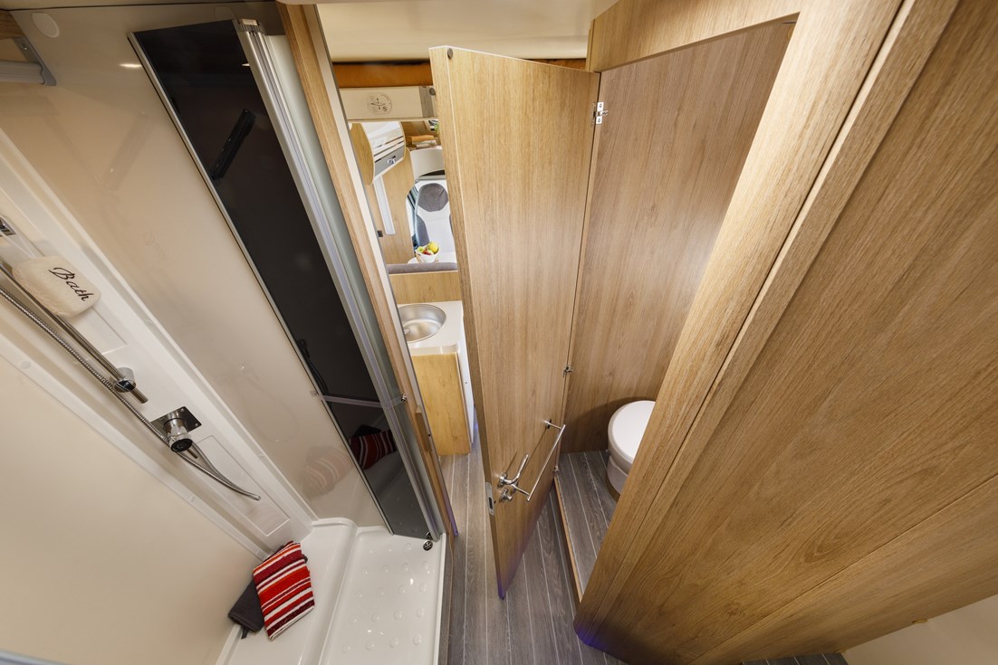 Di solito toilette e box doccia fronteggianti è una disposizione riservata ai camper intorno ai sette metri, ma non mancano esercizi di stile anche su furgonati e virtuosismi pure tra i veicoli di dimensioni contenute, per collocare doccia e vano toilette tra la camera padronale e la zona giorno.